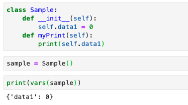 파이썬의 내장함수로 클래스 내 지역변수들을 사전 형태로 보여준다. __dict__ attribute를 반환한다.(객체의 내부 변수가 저장된 딕셔너리)