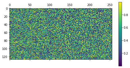 구현 코드는 단순하다. 필자는 torch를 정말 많이 사용하기 때문에 torch를 이용하여 텐서를 하나 만들고, numpy로 변환하여 사용하였다. matplotlib에서 heatmap을 그리기 위해서는 matshow() 함수를 사용한다. 파라미터로 numpy행렬만 넣어주면 끝이다. colorbar는 오른쪽에 보이는 긴 막대기를 의미하고 값에 대한 색의 밝기 진하기를 나타낸다. 위 코드는 random 값으로 행렬을 채웠기 때문에 굉장히 난잡하게 나오지만, 아마 실제 값을 찍어보면 멋있게 나올것이다 (개인적으로 필자는 heatmap이 멋있어 보인다).