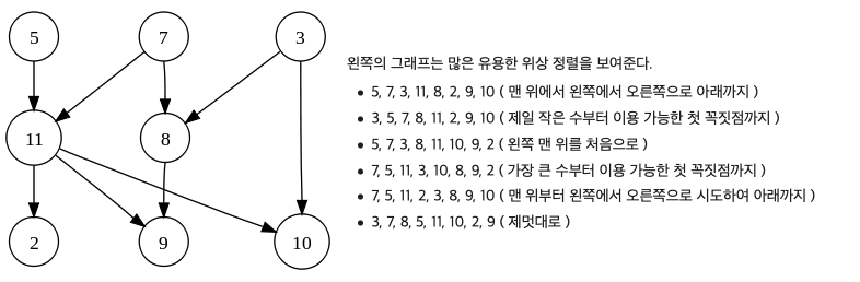 위상 정렬(topological sorting)은 유향 그래프의 꼭짓점들(vertex)을 변의 방향을 거스르지 않도록 나열하는 것을 의미한다. 위상정렬을 가장 잘 설명해 줄 수 있는 예로 대학의 선수과목(prerequisite) 구