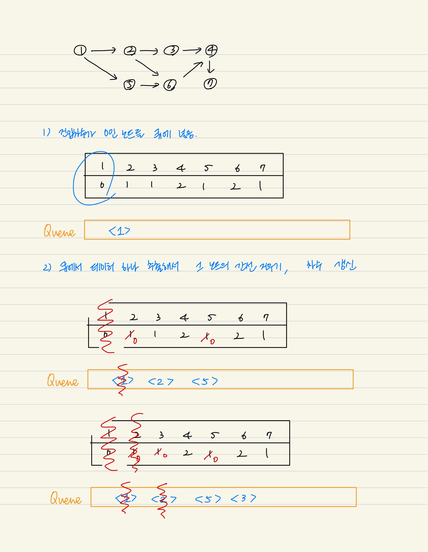 # 처음 시작할 때 진입차수가 0인 노드를 큐에 삽입